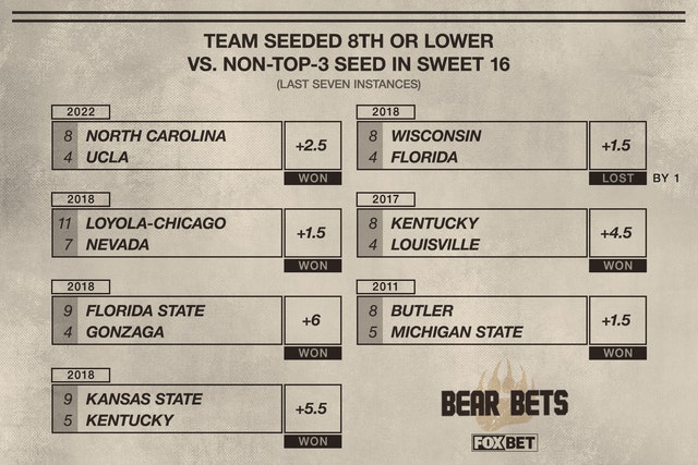In the past 10 years, there have been 18 instances where a team seeded eighth or lower faced a team not a No. 1 seed in the Sweet 16 and weren’t facing another team seeded eighth or lower. Those 18 teams went 15-3 ATS with eight outright wins.