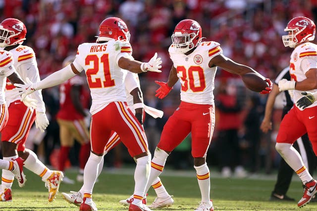 The Chiefs’ defense intercepted Brock Purdy three times in their win over the 49ers, with Christian Roland-Wallace (30) coming up with one of the picks. (Photo by Ezra Shaw/Getty Images)