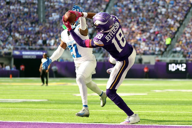 The Vikings didn’t secure a win over the Lions in Week 7, but Justin Jefferson had 81 receiving yards and a touchdown in the loss. (Photo by David Berding/Getty Images)