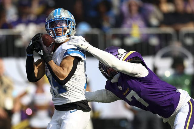 Lions WR Amon-Ra St. Brown had a strong performance against the Vikings, recording eight receptions for 112 yards. (Photo by Kevin Sabitus/Getty Images)