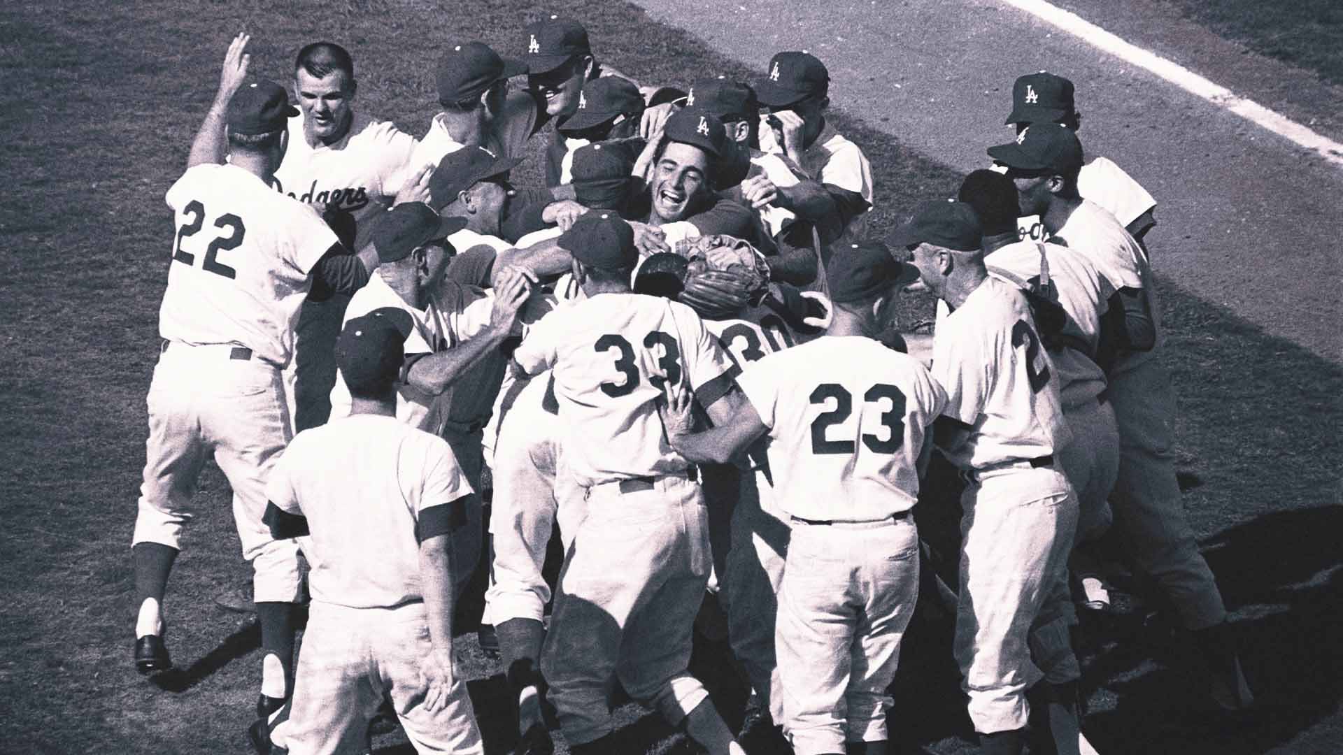 Sandy Koufax is mobbed by his teammates after the Dodgers completed their sweep of the Yankees in the 1963 World Series. (Getty Images)